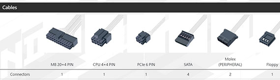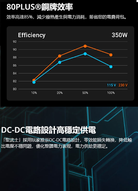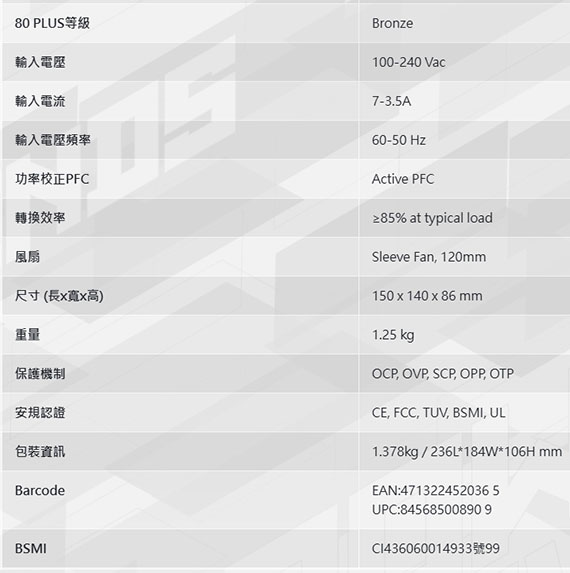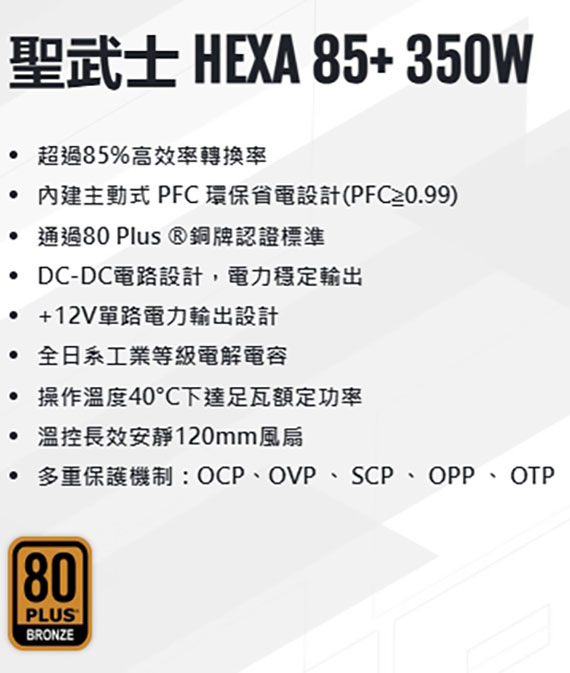 350W,80plus銅牌,符合ATX12V V3.0規範,主動式 PFC 環保省電設計,溫控120mm低噪風扇,具備各項電源護機制(OCP, OVP, SCP, OPP, OTP), 線材接頭:MB 20+4pin*1/CPU 4+4pin*1/SATA*4/PCI-E 6pin*1/Molex*2/Floppy*1,原廠五年免費保固維修,兩年故障免費換新 BSMI認證碼: R43001