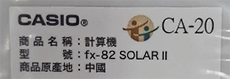 10+2位數,38按鍵,144個函數,組合/排列,指數計算,對數計算,座標轉換,連續計算,附帶硬式外蓋,僅支援太陽能電力(注意:僅可在能接受太陽能電力支援的場合使用),尺寸(深寬高):121.5x70.5x9mm,重量55g,二年保固,BSMI 字號:D33C78,國考型號: CA-20 BSMI認證碼: D33C78