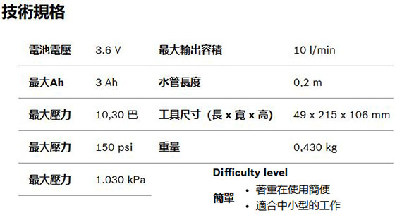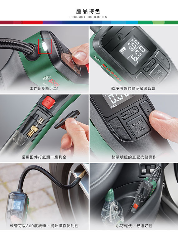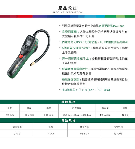 內建電池3.6V及USB-C充電功能,利用即時測量及自動停止功能充氣至最高10.3bar,適合為輪胎(汽車、機車、自行車)、球類及小型水上運動設備充氣,各種轉接器收納在工具把手中,附有大型顯示幕,LED燈提供明亮照明