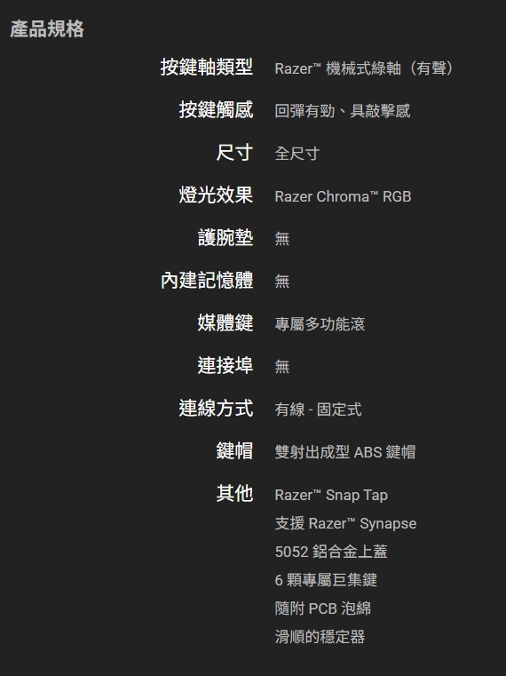 有線、機械式、綠軸、全尺寸、雙色ABS鍵帽、支援Razer Synapse、6顆專屬巨集鍵、多功能滾輪、採用5052 鋁合金打造、二年保固