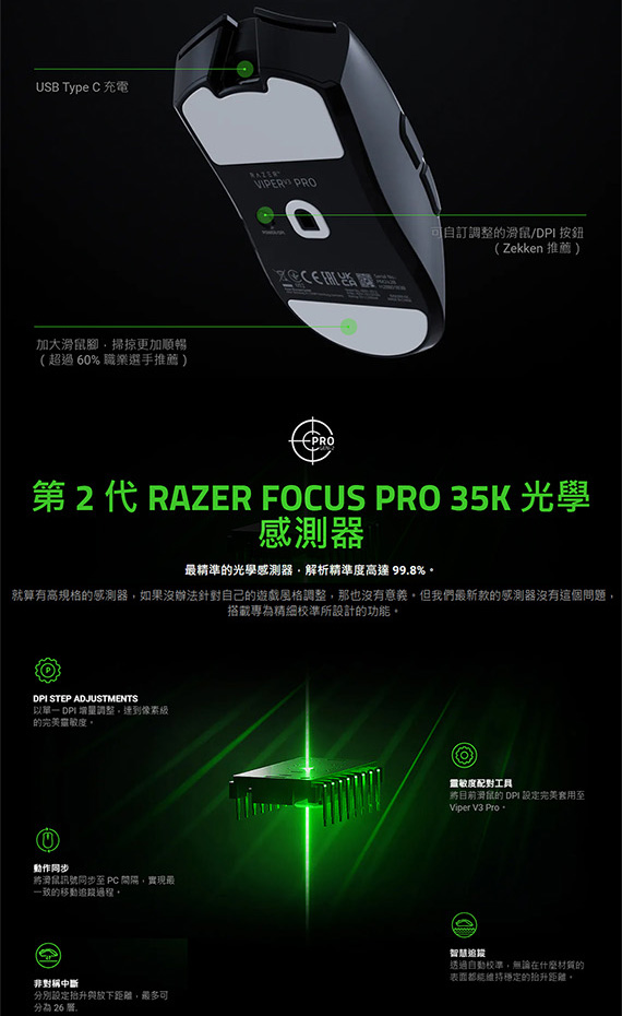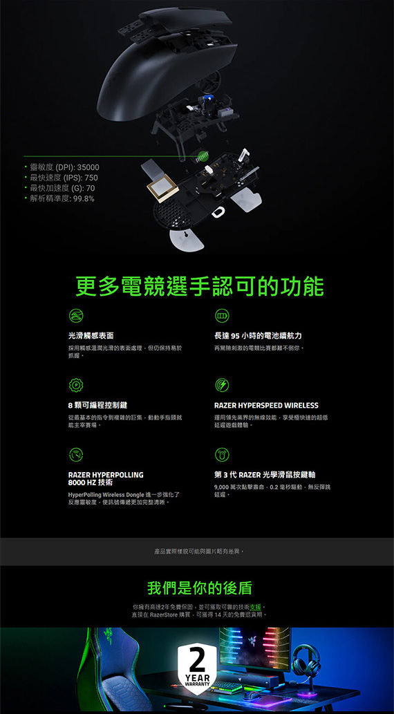 Razer HyperSpeed Wireless+有線、Focus Pro 35K 光學感測器、解析度35000dpi、70G加速度、6個可編成按鍵、續航力最長17小時(8000Hz)/最長95小時(1000Hz)、第3代RAZER光學滑鼠按鍵軸、54g超輕量設計 NCC認證碼: CCAH24LP1200T0 BSMI認證碼: R39212