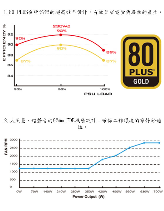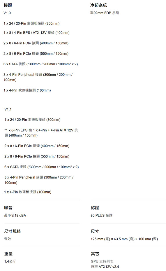 700W,80PLUS金牌,單組+12V,92mm風扇,噪音最小值18 dBA,線材:MB 24(20+4)pin*1,EPS 8pin*1/,4-Pin ATX 12V*1,PCIE 8(6+2)pin*4,SATA*6,周邊4 Pin*3,FDD*1,支援標準SFX電源尺寸規格,±3%電壓穩定度與極低雜訊 BSMI認證碼: R33900