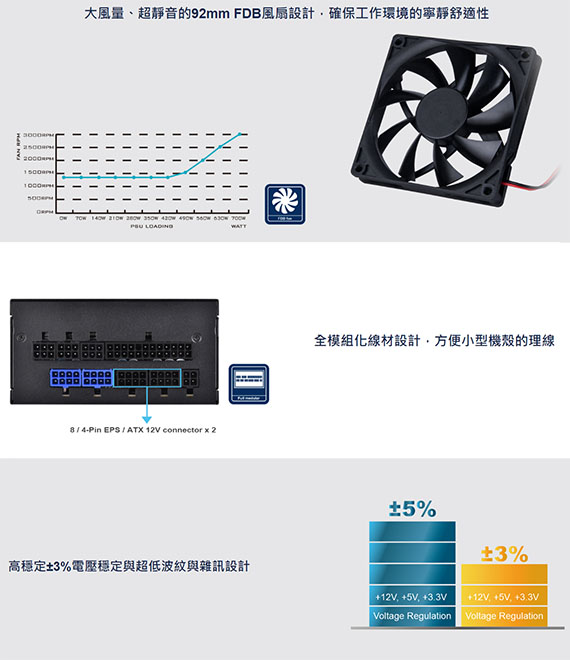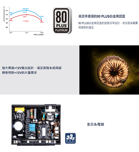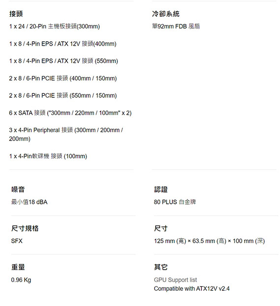 700W,80Plus白金牌認證,單組+12V,92mm風扇,線材接頭:MB24(20+4pin)*1,EPS(4+4pin)*2,PCIE(6+2pin)*4,SATA*6,周邊4 Pin*3,FDD*1,支援標準SFX電源尺寸規格,±3%電壓穩定度與極低雜訊,線材皆以超軟扁排線製作 BSMI認證碼: R33900