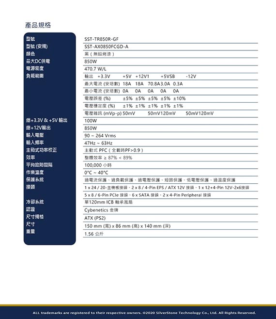 SilverStone銀欣 850W SST-TR850R-GF Triton 850Rx Cybenetics金牌 ATX3.1 PCIe5.1 電源供應器 日系電容