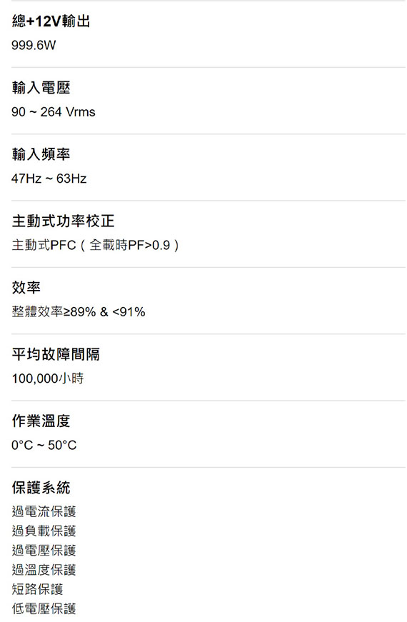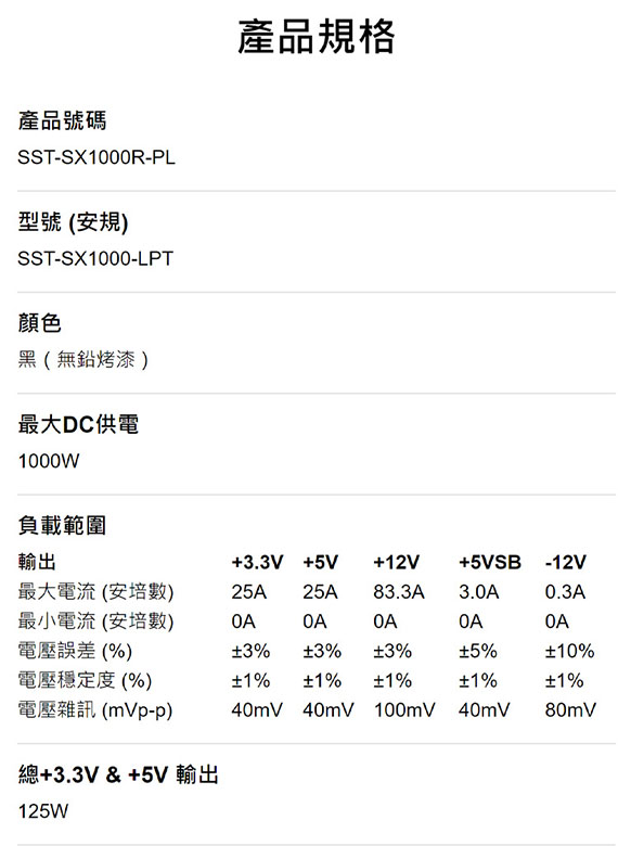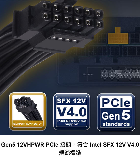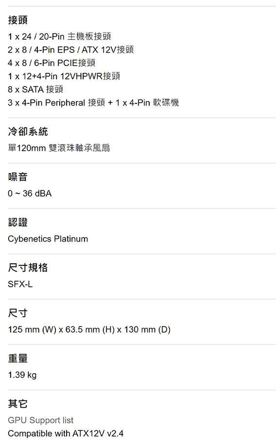 1000W,Cybenetics白金牌認證,單組+12V,單120mm雙滾珠軸承風扇,線材:MB(20+4)pin*1,,EPS(8/4-Pin)*2,PCIe(6+2)pin*4,PCIe 5.0(12+4)pin*1, SATA*8,周邊4Pin*3,Floppy*1,SFX-L尺寸規格支援小型化機殼,高品質用料及全日系電容 BSMI認證碼: R33900