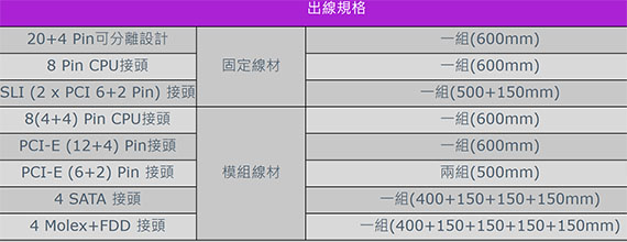 - 高階顯示卡專用接頭:6+2Pin,可相容於各廠牌之顯卡電源接座。