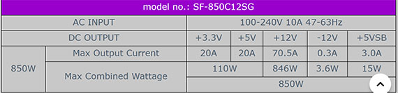 850W、Cybenetics金牌認證、單組+12V、120mmFDB風扇、線材:MB(20+4pins)*1、CPU(8pin)*1、CPU(4+4pins)*1、PCIe(12+4pins)*1、PCIe(6+2pins)*2、SLI(2xPCI6+2Pin)*1、4SATA*1、4Molex*1、半模組化設計、ECO設計、100%日本105°C電容、支援NVIDIA SLI & ATI CrossFireX高效能顯示卡、七年保固