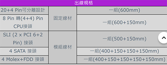 - 高階顯示卡專用接頭:6+2Pin,可相容於各廠牌之顯卡電源接座。