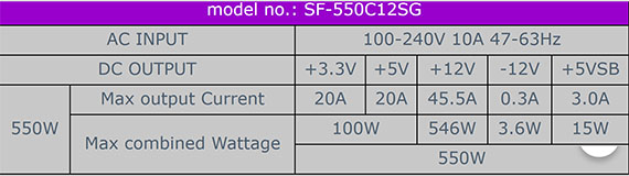 550W、Cybenetics金牌認證、單組+12V、120mmFDB軸承靜音風扇、線材:MB(20+4)*1、CPU(4+4)*1、PCIe(6+2pin)*2、4SATA*1、4Molex*1、符合Intel SSI電源設計規範ATX 12V v3.1, EPS 12V v2.92、多重獨立保護設計、全電壓設計(100~240V)、具備主動式功率校正因素裝置(APFC)、採用日系長效大電容