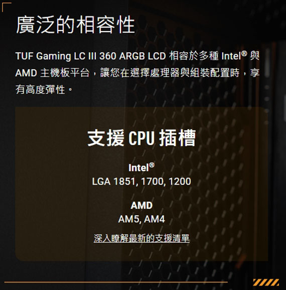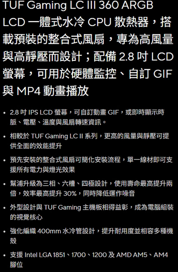 CPU腳位:INTEL:LGA 1851/1700/1200,AMD:AM5/AM4,內建TUF GAMING LC III 360 ARGB MF-12 FAN,風扇尺寸360x120x26.6 mm,風速:650-2600±10%RPM,風量:90.78CFM,噪音:37.4dB(A),靜壓:3.82mmH2O,散熱器尺寸(含扇):397x120x27mm,2.8吋IPS LCD螢幕,預裝整合風扇,獨家TUF軟體,提升耐用性及機殼相容性,保固6年