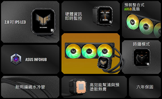 TUF Gaming LC III 360 ARGB LCD 搭載 2.8 吋 IPS LCD,支援主題動畫、硬體資訊及自訂內容,使其成為遊戲電腦中吸睛的視覺焦點。高效能幫浦與預裝整合式 ARGB 風扇能有效處理系統散熱,帶來穩定的遊戲效能。