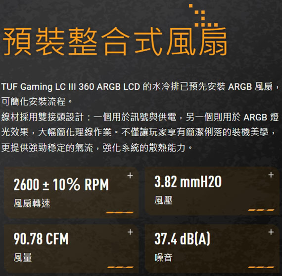 • 風扇:TUF GAMING LC III 360 ARGB MF-12 FAN