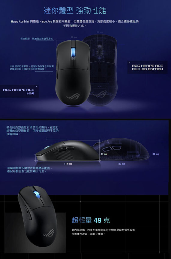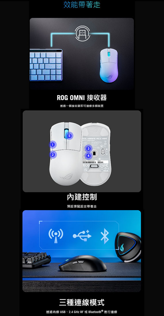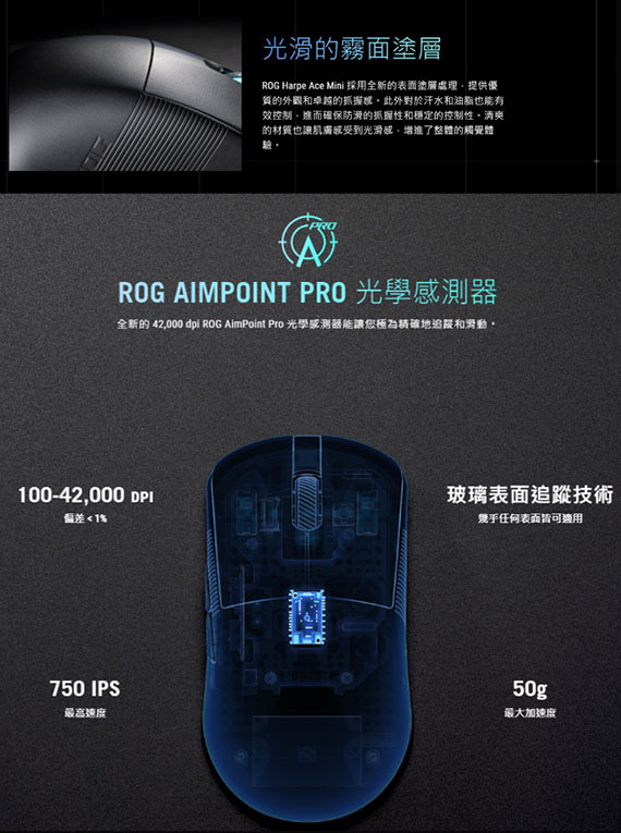 三模連線(2.4GHz/藍牙/USB2.0)、ROG AimPoint Pro光學感測器、ROG 100M光纖微動開關、解析度100-42000dpi、8000Hz(附ROG輪詢速率增強器)、ROG Omni接收器、ROG SpeedNova無線技術、ROG輪詢率增強技術、單個接收器無線連接多個支持的設備、49克超輕重量、經過專業認可的 Harpe Ace 滑鼠的更小外形,適合更廣泛的手形和握持類型 NCC認證碼: CCAH24LP7290T5 BSMI認證碼: R31018