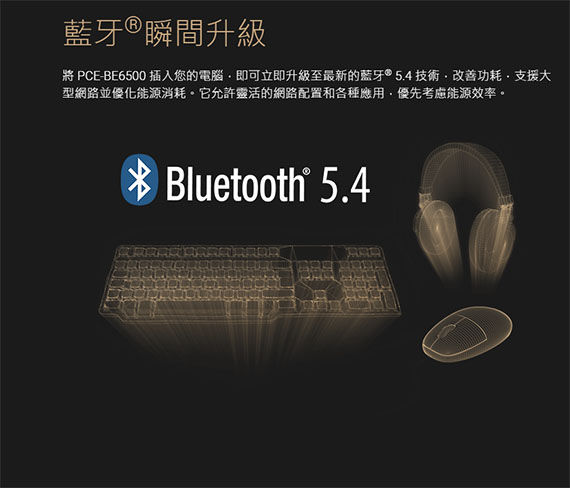 將 PCE-BE6500 插入您的電腦,即可立即升級至最新的藍牙® 5.4 技術,改善功耗,支援大型網路並優化能源消耗。它允許靈活的網路配置和各種應用,優先考慮能源效率。