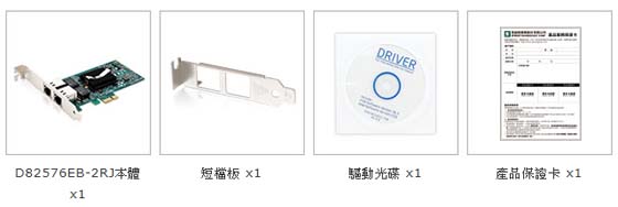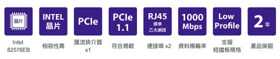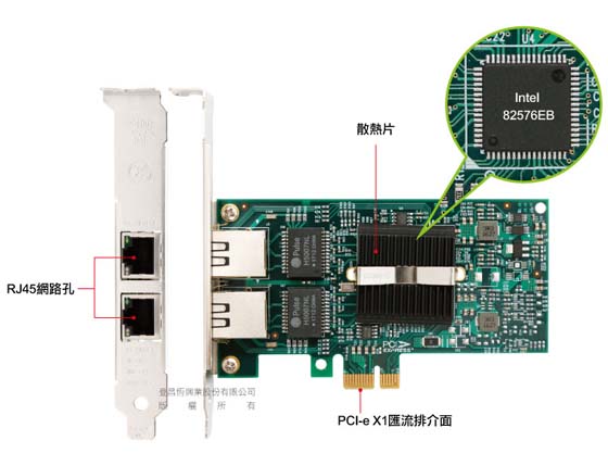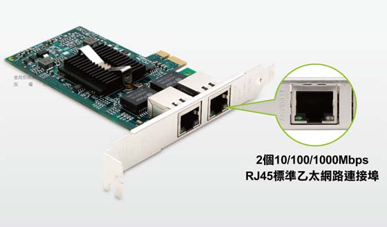 PCI-E X1支援1.1,RJ45*2埠,Intel 82576EB晶片,每端口支持的數據速率:10/100/1000 Mbps,MSI-X支持,於Windows環境的可擴展I / O和用於Linux環境(IPv4,IPv6,TCP / UDP)的可擴展I / O,喚醒LAN支持,長/短板設計