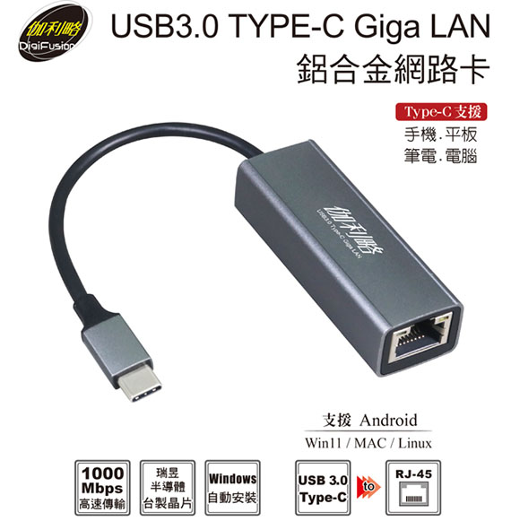 【上一個】【下一個】 | DigiFusion 伽利略 G-TM035 Type-C Gigabit 鋁合金外接網路卡