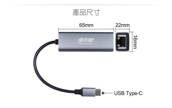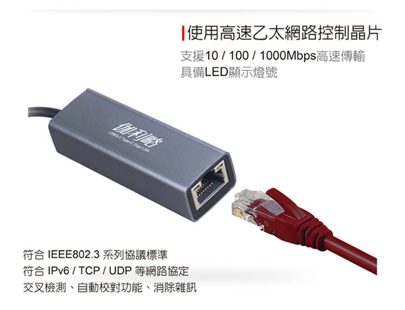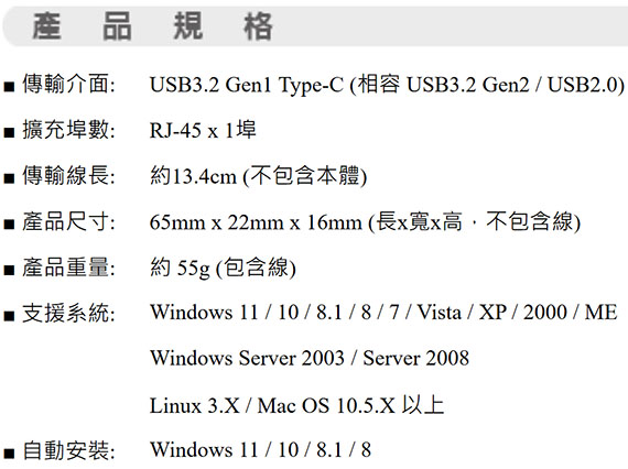 Type-C USB3.0介面、提供1*RJ-45、支援10/100/1000Mbps高速傳輸、交叉檢測和自動校對功能、支援遠程喚醒和"RealWoW!"功能、具備LED指示燈顯示、支援自動安裝驅動程式的功能