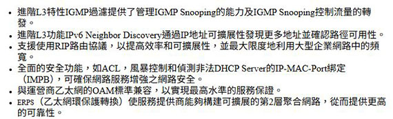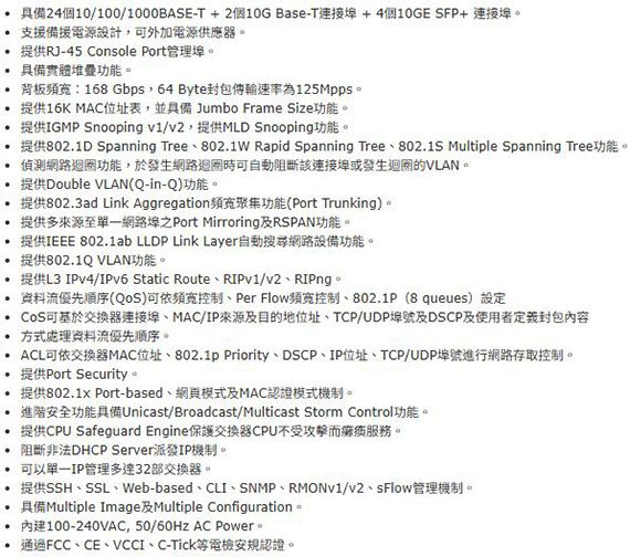 具備24個10/100/1000BASE-T + 2個10G Base-T連接埠 + 4個10GE SFP+ 連接埠、支援備援電源設計、提供RJ-45 Console Port管理埠、具備實體堆疊功能、背板頻寬:168 Gbps,64 Byte封包傳輸速率為125Mpps、偵測網路迴圈功能、提供Double VLAN(Q-in-Q)功能、阻斷非法DHCP Server派發IP機制、可以單一IP管理多達32部交換器