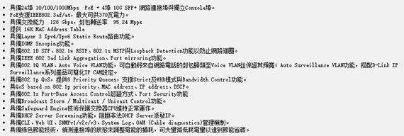 提供24*10/100/1000Base-T RJ45+ 4*10G SFP+光纖埠與獨立Console埠、具備Console port及Full CLI管理功能、最大可供370瓦電力、具備Layer 3 Ipv4/Ipv6 Static Route路由功能、具備IPv6管理功能,支援IPv4/IPv6 Dual Stack、具備IGMP Snooping功能、具備Auto Voice VLAN功能、具備Auto Surveillance VLAN功能、支援Strict及WRR模式與Bandwidth Control功能、具備Broadcast Storm / Multicast / Unicast Control功能、具備SSH、SSL v1/v2/v3安全加密透過瀏覽器登入管理交換器機制