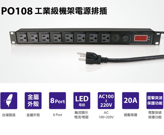UPMOST登昌恆 PO108 8插 3孔 3M 19吋機櫃1U 數位式電錶工業級機架電源排插 20A