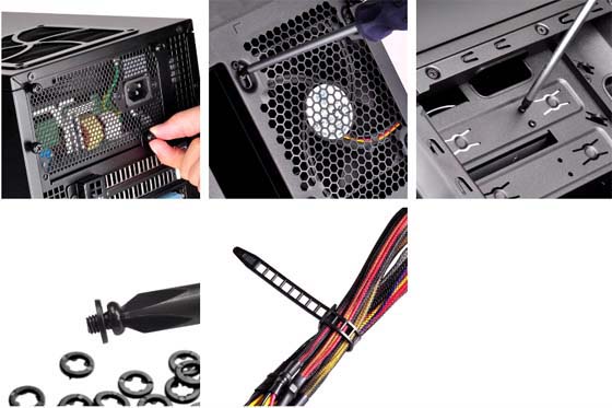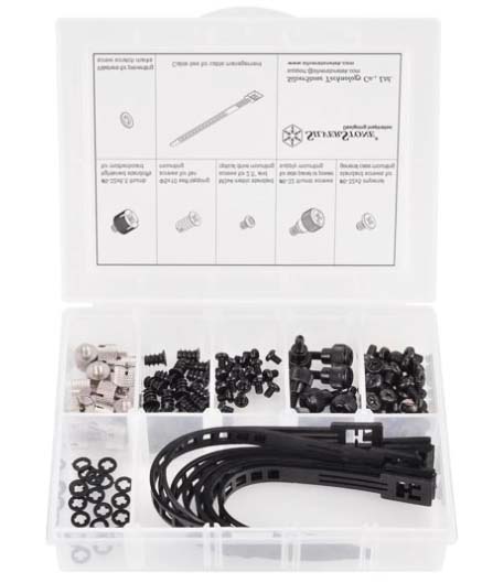 分類置放空間,主機板手扭螺柱及側板、電源手扭螺絲,標準鎖固機殼螺絲及風扇專用自攻螺絲,光碟機、2.5吋硬碟專用小螺絲,防刮用墊片與整理束線帶