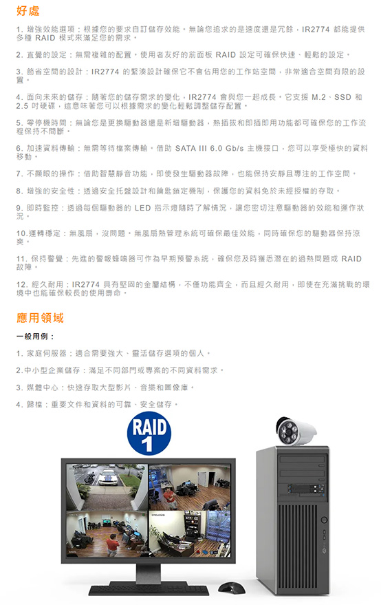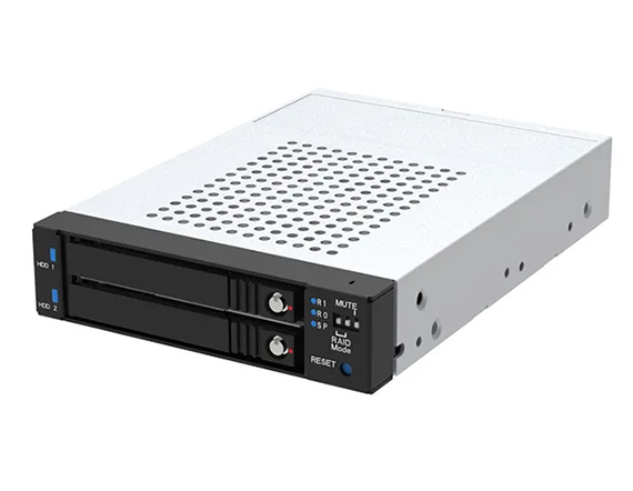 內接式,與3.5吋硬碟外型尺寸相同。支援2顆硬碟,支援M.2(含RAIDON SATA轉換器)、SATA SSD, 和2.5吋HDD。四種RAID模式: RAID 0、RAID 1、JBOD 和 SPAN(BIG),JMS562晶片。直接從前面板輕鬆調整RAID模式,托盤鑰匙鎖保護機制,每個驅動器上都有單獨的LED指示燈,警報系統,智慧型靜音功能,金屬製成,尺寸147x102x26mm(長x寬x高),產品本體(不含硬碟)