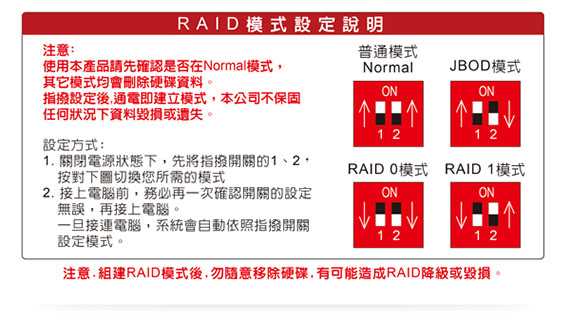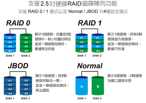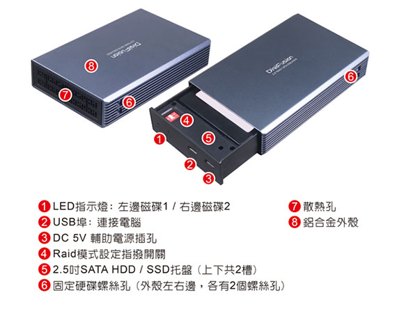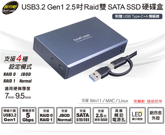 USB Type-C傳輸介面、USB3.2 Gen1規格、速度最高可達到5Gbps、支援RAID 0/ RAID 1/ JBOD/ Normal四種設定模式、支援 SATA I/II/III 2.5吋硬碟/ SSD(支援厚度7mm/9.5mm)、具備輔助電源孔、具備LED指示燈、鋁合金外殼,散熱容易