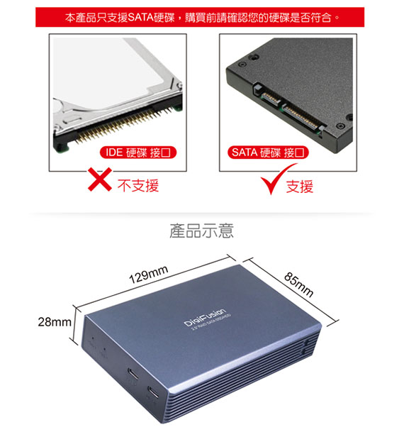 | 適用硬碟 | 2.5吋 SATA I/II/III HDD / SSD 硬碟 (支援厚度7mm / 9.5mm) |