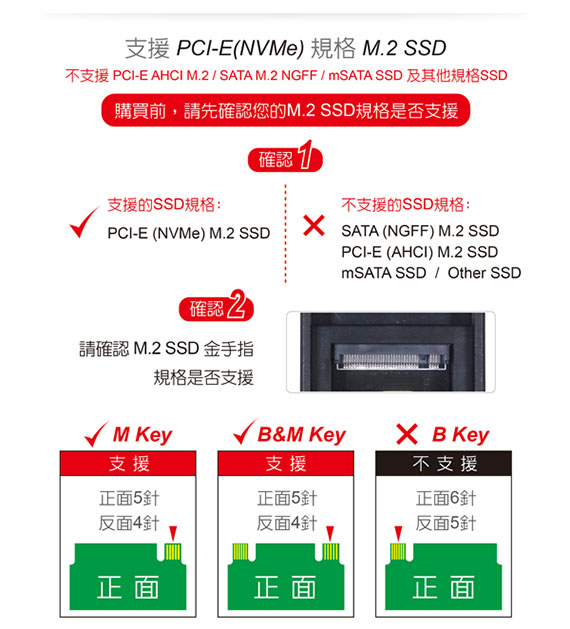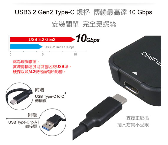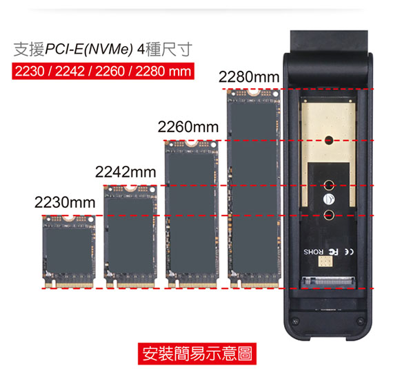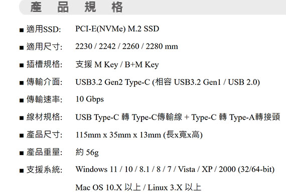 Type-C USB3.2 Gen2介面、支援PCI-E(NVMe)規格 M.2 SSD、適用尺寸:2230/2242/2260/2280mm、支援UASP SCSI協定、具備休眠模式、具LED指示燈、翻蓋式設計、鋁合金散熱蓋板、附贈USB Type-C轉Type-C傳輸線