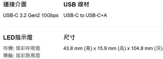 Type-C 介面,3.2 Gen2 傳輸速率10Gbps,適用NVMe 或 SATA M.2,散熱鋁製外殼,夾層分層設計提高穩定性,RGB 燈光效果,,內附USB-C to USB-C+A傳輸線,尺寸:104.8x43.8x15.9mm,重量97g