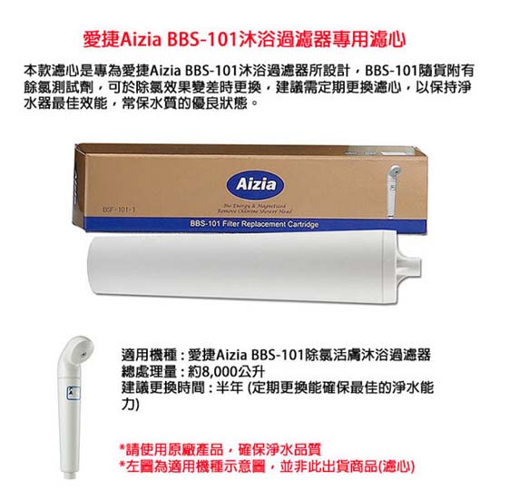 適用機種 : 愛捷Aizia BBS-101,淨水量 :8,000公升,產地 : 台灣,建議更換時間 : 半年