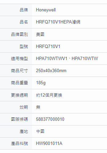 適用型號: HPA-710WTW,HPA-710WTWV1,過濾PM0.3微粒達99.97,每批到貨產地都不同,介意者請洽客服