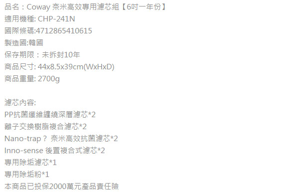 Coway CHP-242N 奈米高效 6吋 一年份 濾芯組
