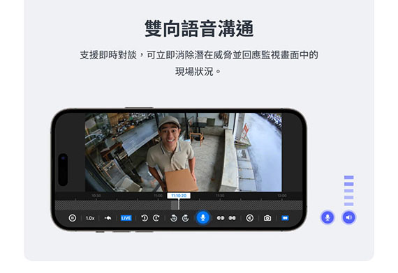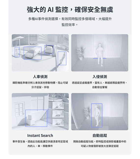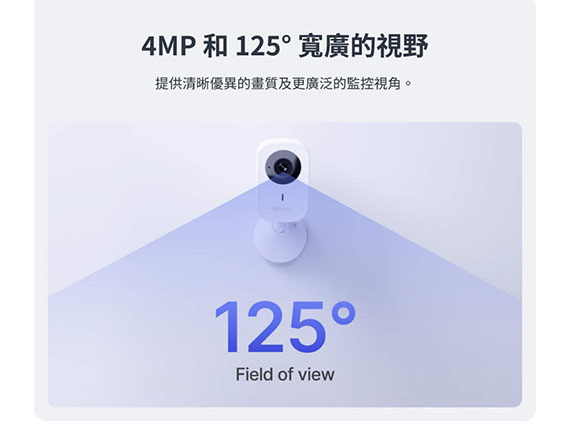 1/3吋影像感測器、紅外線距離10m、波長850nm、4MP和125°寬廣的視野、影片解析度2560x1440@30fps、2.4/5GHz Wi-Fi連線、IP65防水防塵、雙向語音溝通、採用高動態範圍(HDR)技術、內建AI分析功能、二年保固
