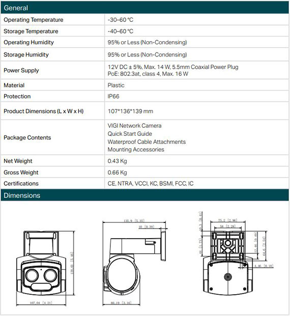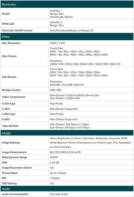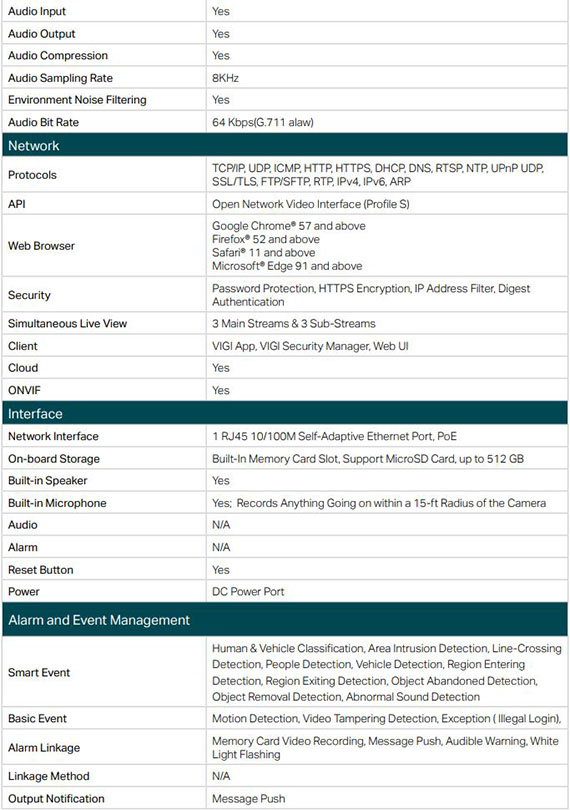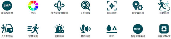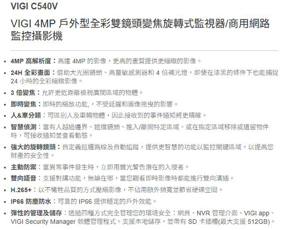1/3吋逐行掃描CMOS,紅外線切換濾鏡,3倍變焦更近距離檢視廣闊區域的物體,即時變焦,旋轉鏡頭:自定義巡邏路線及自動追蹤,高達4MP的影像,24H(24小時)全彩畫面,H.265+不犧牲品質的方式壓縮影像, RJ45 10/100M乙太網路埠,PoE,本地儲存,有SD卡插槽(最大支援256GB), DC供電埠,IP66 防塵防水,人&車辨識,智慧偵測,當異常事件發生時,立即用聲光警告潛在的入侵者,雙向語音支援對講功能, 網頁、NVR 管理介面、VIGI app、VIGI Security Manager 軟體管理程式
