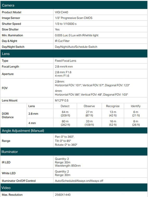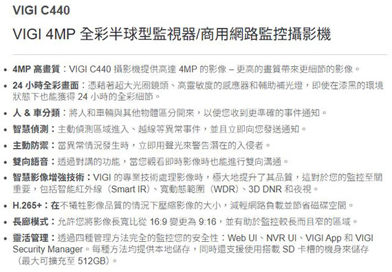 VIGI C440 4MP 全彩半球型監視器/商用網路監控攝影機 |