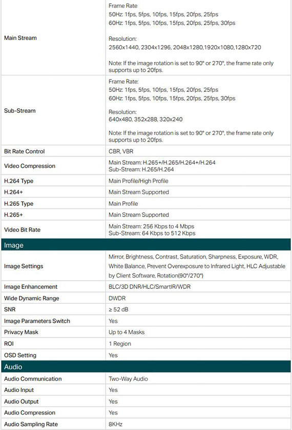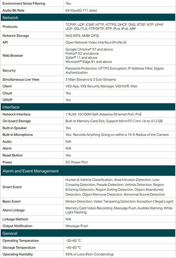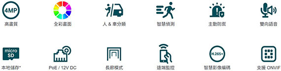 4MP解析度,全彩畫面,1/3逐行掃描 CMOS,30公尺智慧紅外線,固定鏡頭焦距2.8mm,光圈F1.6,可視角度水平視野: 79°,垂直視野: 43°, 對角線視野: 93°,傳輸介面: 1*RJ45 10/100M乙太網路孔,Micro SD記憶卡,兩種供電PoE/12V DC,智慧偵測 (人像偵測、移動偵測、越線偵測、區域入侵、鏡頭遮蔽),H.265+ 智慧編碼,遠端監控,雙向語音,寬動態範圍(WDR)