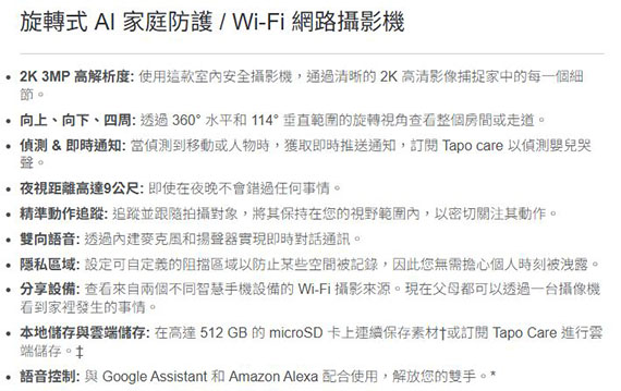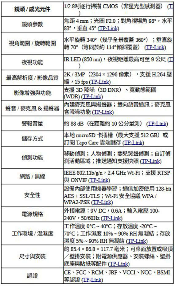 3MP 2K(2304x1296)解析度,1/2.8吋感光元件,9公尺夜視距離,鏡頭焦距3.83mm,可視角度水平視野: 360°,垂直視野: 114°,Wi-FI,支援高達512GB的MicroSD卡儲存空間,嬰兒哭聲偵測,人像/移動偵測,可自訂的隱私模式,雙向語音,Tapo共享