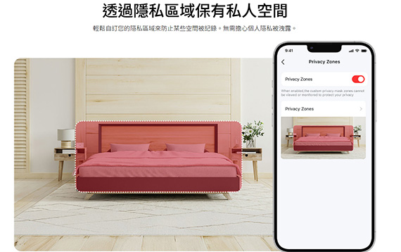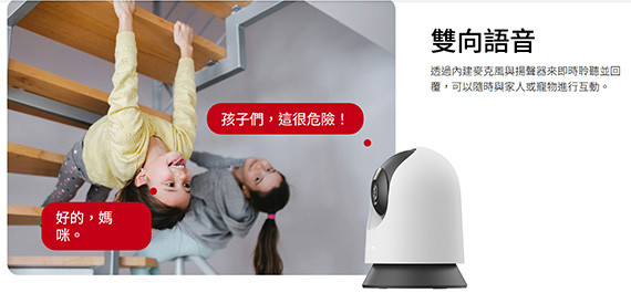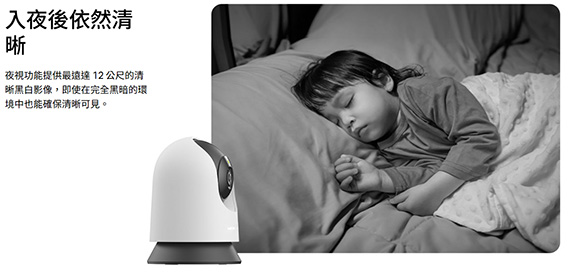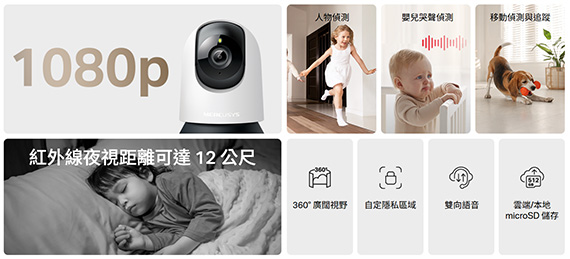 1080p(1920×1080)解析度,1/3.2逐行掃描CMOS非星光感應器,12公尺夜視距離,鏡頭焦距4mm,水平旋轉範圍:340°(可達360°水平覆蓋), 垂直傾斜範圍:70°(可達110°垂直覆蓋),Wi-FI,Micro SD卡插槽(最高支援512GB),嬰兒哭聲偵測,人像/移動偵測,可自訂的隱私模式,雙向語音