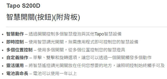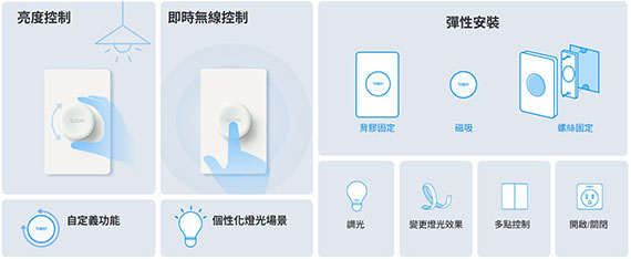 無線, 須搭配Tapo智慧網關,使用CR2032電池供電, 將智慧遙控調光開關放在任何您想要的地方,讓照明控制觸手可及, 自定義操作, 透過開關控制多個智慧燈泡與其他Tapo智慧設備, 使用智慧調光開關,無需應用程式即可控制您的智慧設備, 使用多個開關從多個位置控制您的智慧燈具