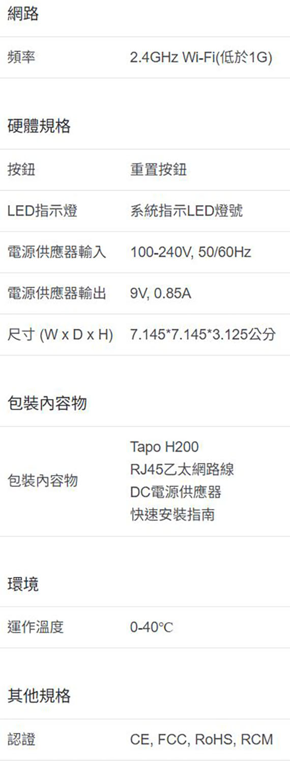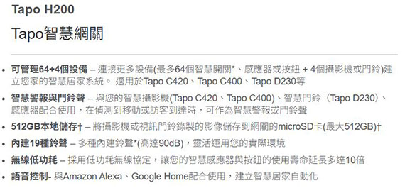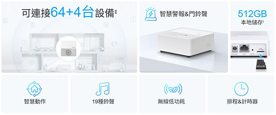 2.4GHz Wi-Fi,建立智慧居家系統, 搭配適用:Tapo C420、Tapo C400、Tapo D230...等, 可管理64+4個設備,DC電源供應器,錄製影像儲存到網關的microSD卡(最大512GB),內建19種鈴聲可作警報或門鈴聲,與Amazon Alexa、Google Home配合使用語音控制 NCC認證碼: CCAQ22LP0430T8