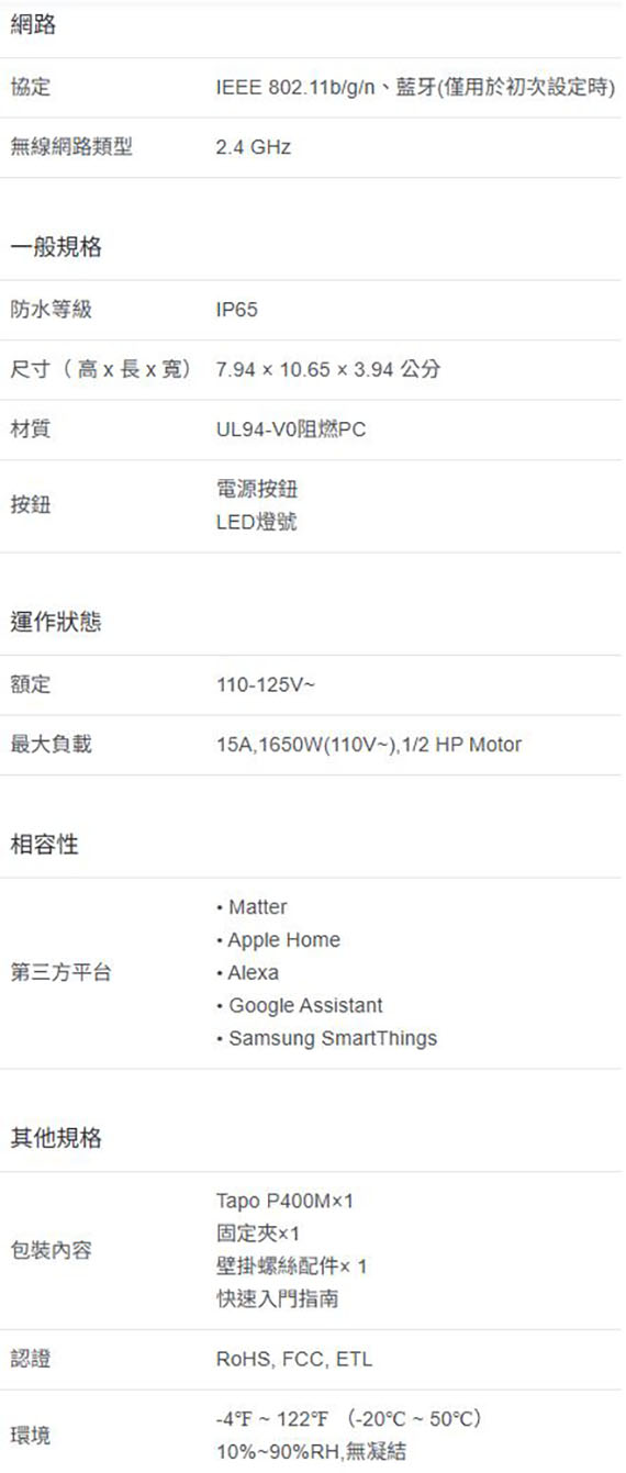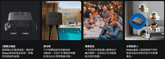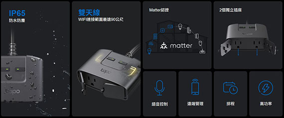 2.4GHz、Matter認證、遠距離Wi-Fi範圍可達90公尺、IP65防塵防水、雙插座、語音控制、遠端管理、預設時間排程、不在家模式、電源需求:15A,1650W,110-125V~ NCC認證碼: CCAH23LP2060T7 BSMI認證碼: D38330