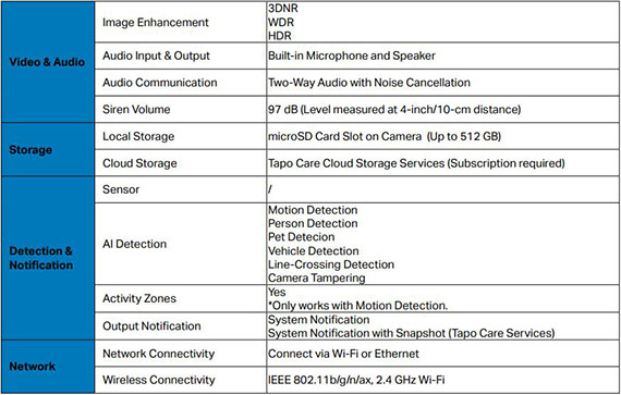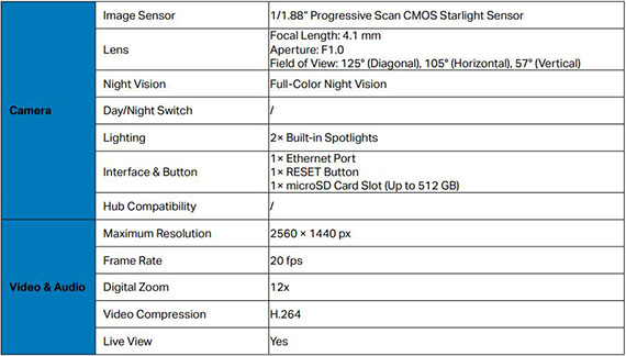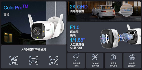 F1.0超大光圈與1/1.79吋感光元件,ColorPro全彩夜視,高達127°的視野提供更廣的偵測範圍,2K QHD(2688×1520)即時影像,乙太網路,Wi-Fi,2.4GHz,將影像儲存到microSD卡(最大支援512 GB)或使用Tapo Care雲端服務,IP66 防水防塵, AI智慧偵測(免費)可辨別人物.動物與車輛,並透過App通知用戶,移動偵測可自訂 NCC認證碼: CCAH23LP0750T9