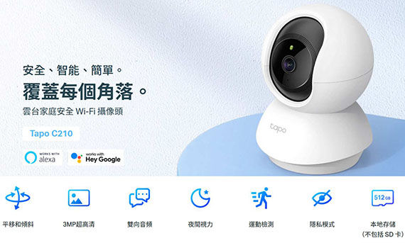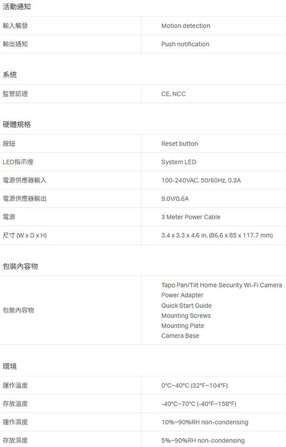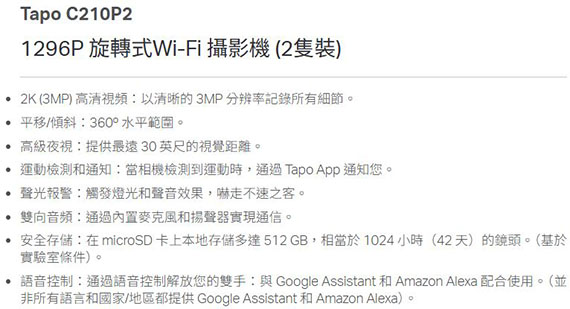 2K(2304 x 1296)@15fps,水平:360°,垂直:114°,夜視:850nm IR LED高達30呎,具備移動偵測與發送警報訊息通知的功能,自動化警報功能,自動觸發燈光與聲音警報,影像即時觀看,雙向語音功能,本地儲存,最大支援256GB記憶卡(另購),透過APP,可一鍵進行水平/垂直巡邏,定位標記,旋轉角度設定,支援16倍速快進,慢速回放,支援倒置安裝,支援多個裝置同時遠端監控,支援Google音箱,語音操控,尺寸(WDH)86.6x85x117.7mm,電源輸入:100-240VAC,50/60Hz,0.3A,輸出:9.0V/0.6A,保固2年 NCC認證碼: CCAR21LP0490T2 BSMI認證碼: D38330