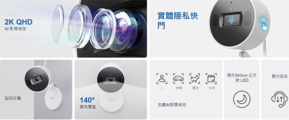 解析度2560×1440(2K QHD)、4MP、1/2.9吋感光元件、夜視850+940nm雙紅外線、140°廣角覆蓋、Wi-Fi連接、支援microSD卡最高512GB(另購)、Tapo Care 雲端儲存、實體隱私快門、智慧AI偵測和通知、使用磁性底座輕鬆安裝、雙紅外線設計、可自訂的聲音警報 NCC認證碼: CCAH23LP8340T4 BSMI認證碼: D38330