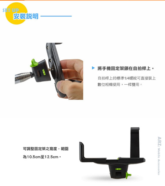 - 溫馨提示:此款無線自拍架出廠已配有大小兩個黑色手機夾,無需再另外購買手機夾,哪個適合用哪一個,自由轉換。