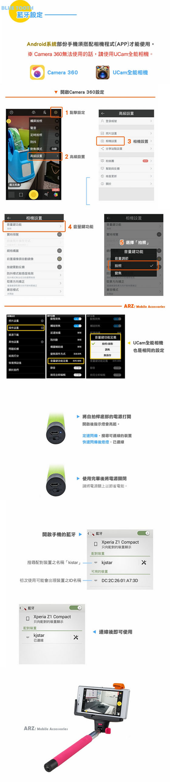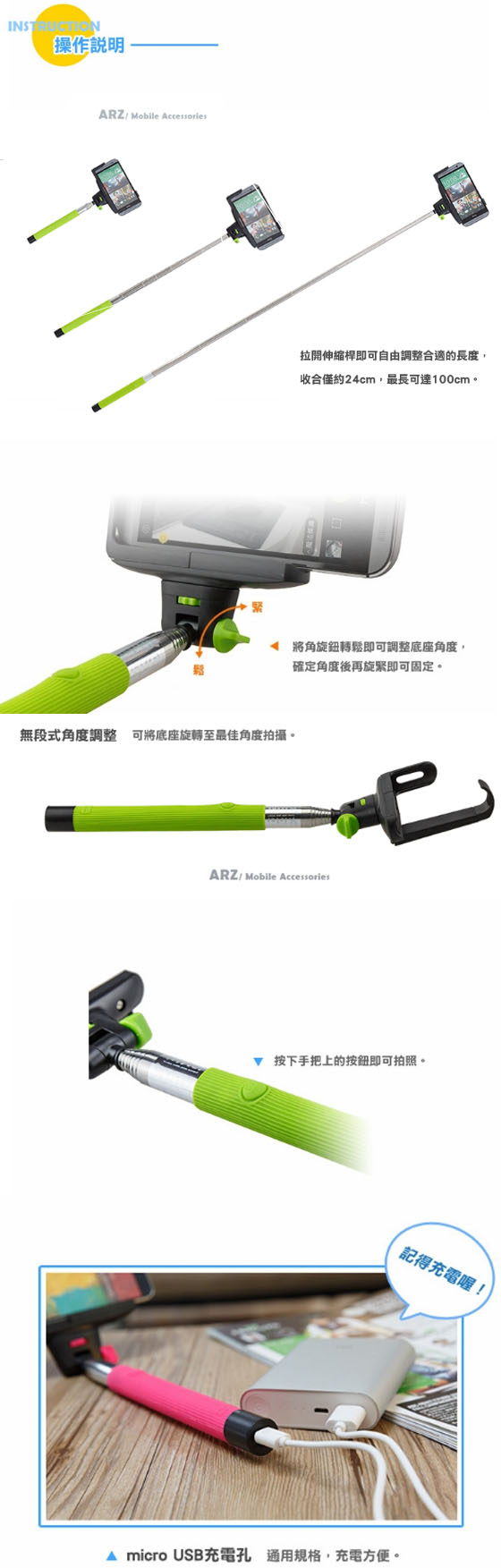 - 產品參數最大載重量: 500g 伸縮長度 :235-1005mm 可夾範圍:56-85mm 主材質 :不銹鋼, 伸縮節數 :7 淨重: :178g 可選色彩 : 黑,粉紅,綠品牌:Kjstar 電池容量:45mAH 充電電壓:5V 充電時間:1小時( 充電後,紅燈會亮,電滿後,燈會滅. )待機時間:100小時以上連拍次數:500次以上支持系統:IOS4.0及以上主要功能:無線手機自拍