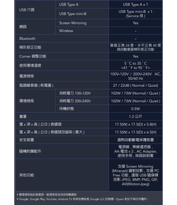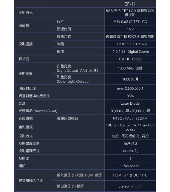 1000流明,1920X1080(Full HD 1080P),對比2500000:1,重量1.2kg,內建喇叭1.5W*1,投影尺寸:30-150吋,HDMI*1,支援Miracast無線投影,無線投射智慧型手機、平板裝置,隨處可投、自動垂直梯形修正,雷射光源,Gamma校正