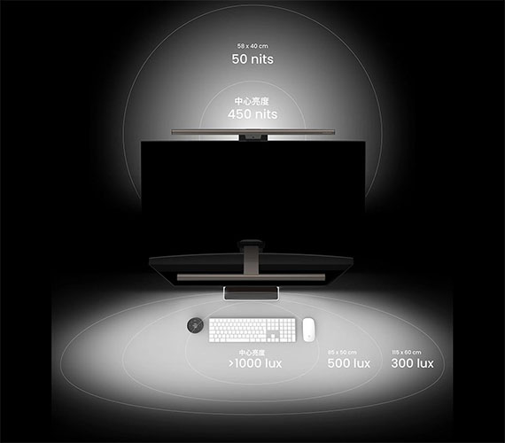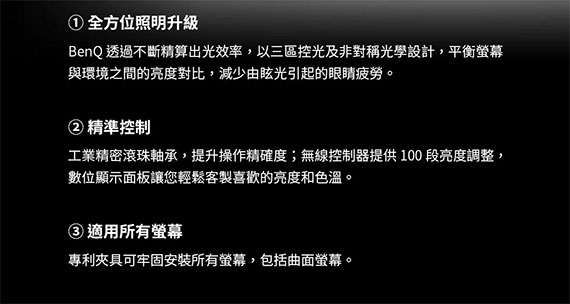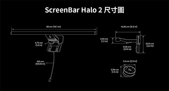 照明範圍(500Lux):85x50cm,尺寸(WxDxH cm):燈頭:50x14.3x10.9/控制器:7.4x7.4x3.95,USB線長度150cm,電源輸入5V/max.3A USB Type-C,專利夾具設計,後補光可以減少螢幕與周圍環境之間的亮度對比,LED 燈珠使用壽命50000小時,無頻閃無藍光,自動感應開啟/關閉,自動感應調光,可調色溫與亮度,符合人體工學設計,可相容螢幕厚度 0.43-6cm,曲率範圍為1000R至1800R之螢幕,一年保固