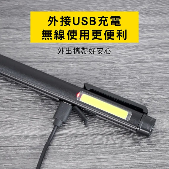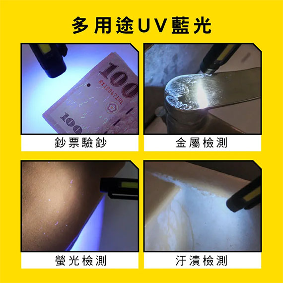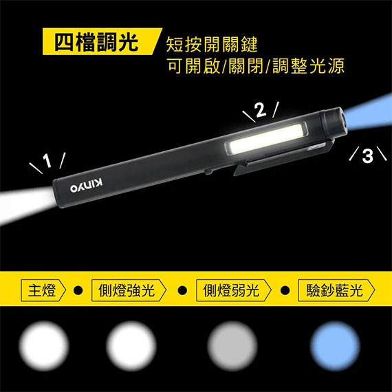 150流明、消功率:3W、採用美國LED XPE+COB高亮度燈泡、三種燈光(XPE白光/COB側燈白光/UV藍光)、四檔光源切換(主燈/側燈強光/側燈弱光/驗鈔藍光)、迷你筆型設計、磁吸金屬夾輕巧便攜、高品質鋁合金材質、IP22防塵防水、USB外接式充電設計、適用不同環境/戶外活動/特殊工作等照明需求